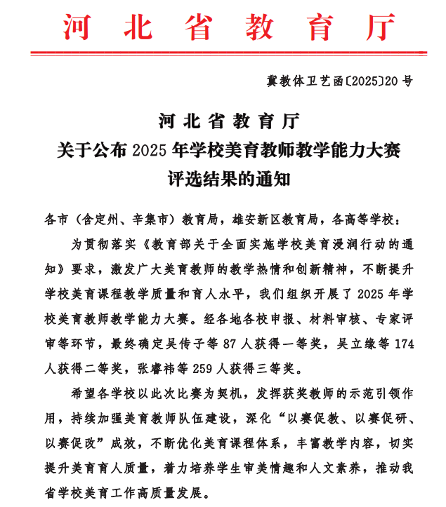 近日,河北省教育厅公布2025年高校美育教师教学能力大赛评选结果,我校教师彭文丽的授课作品《生态之美与心灵之约:走进思想政治教育环境的美学之城》获得三等奖。