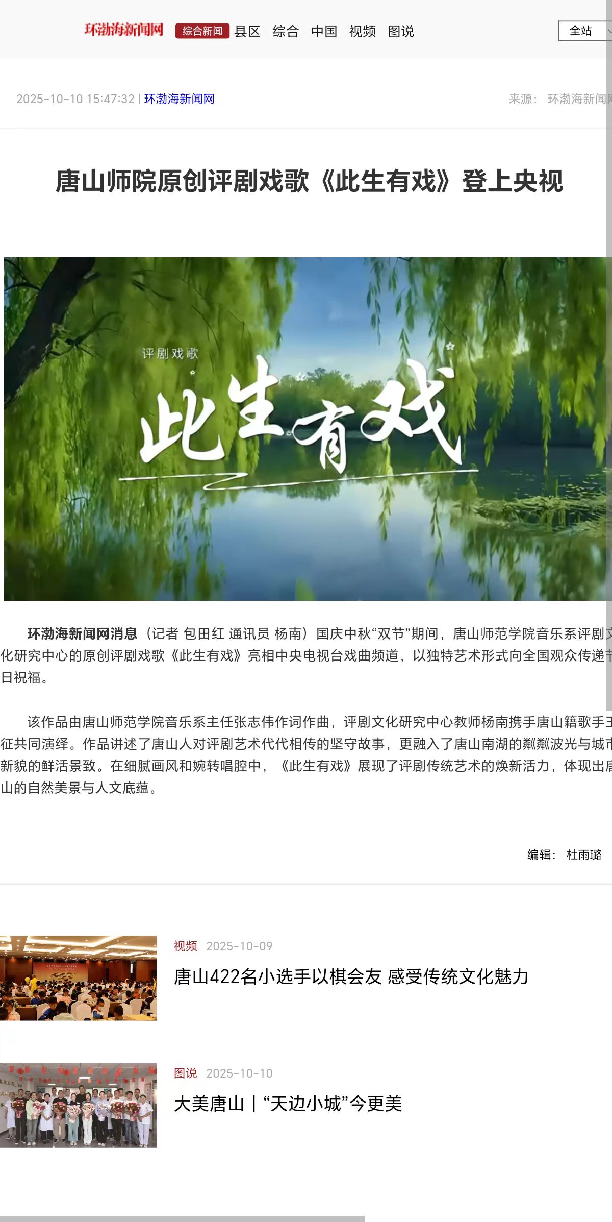 国庆中秋“双节”期间,唐山师范学院音乐系评剧文化研究中心的原创评剧戏歌《此生有戏》亮相中央电视台戏曲频道,以独特艺术形式向全国观众传递节日祝福。