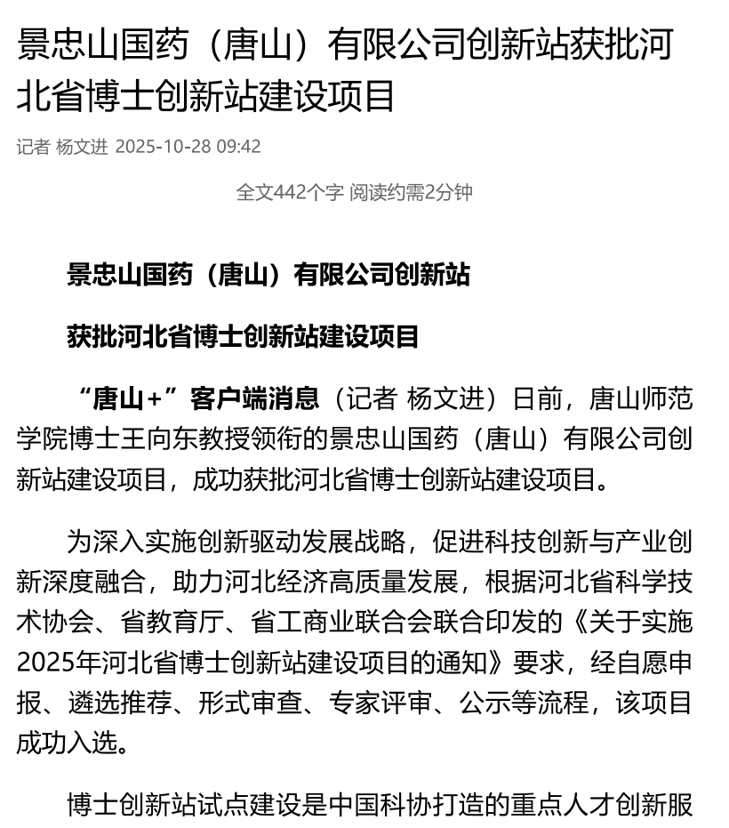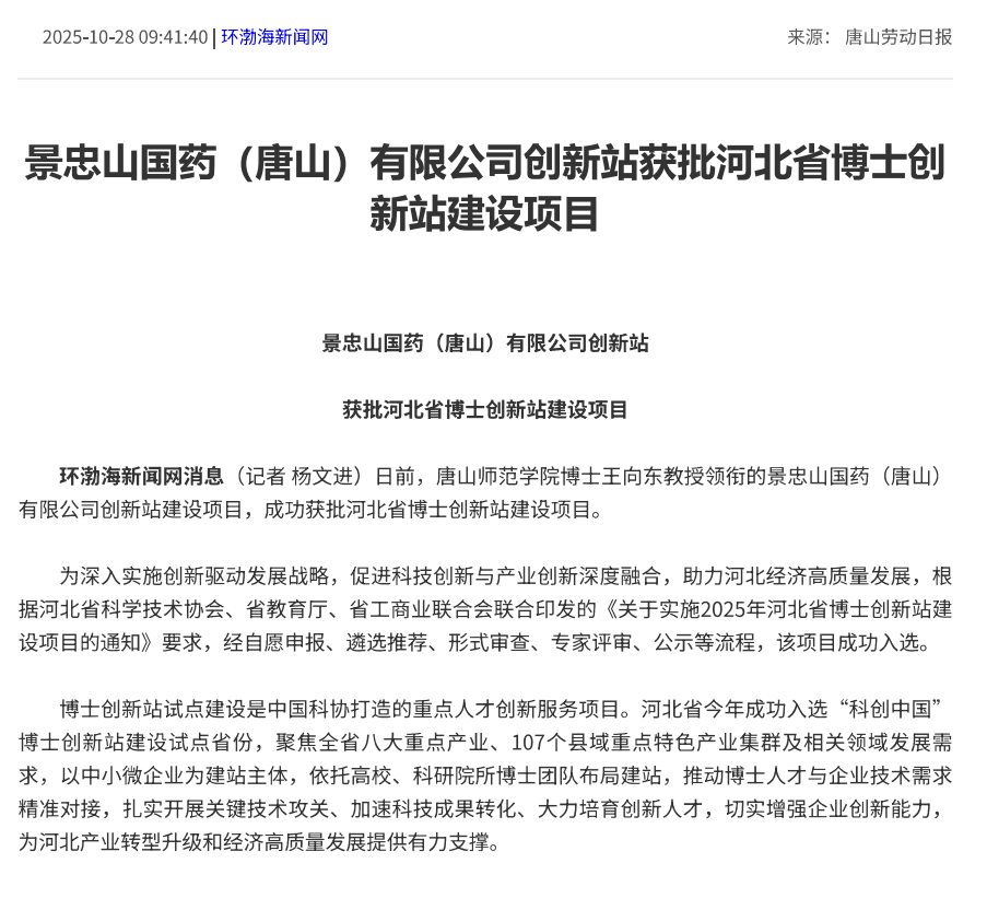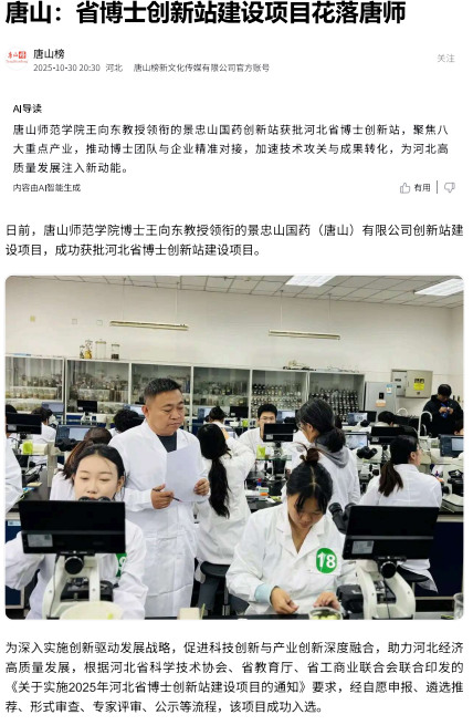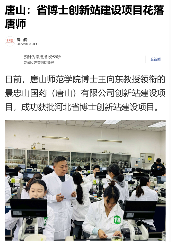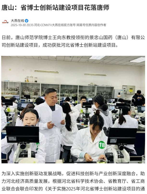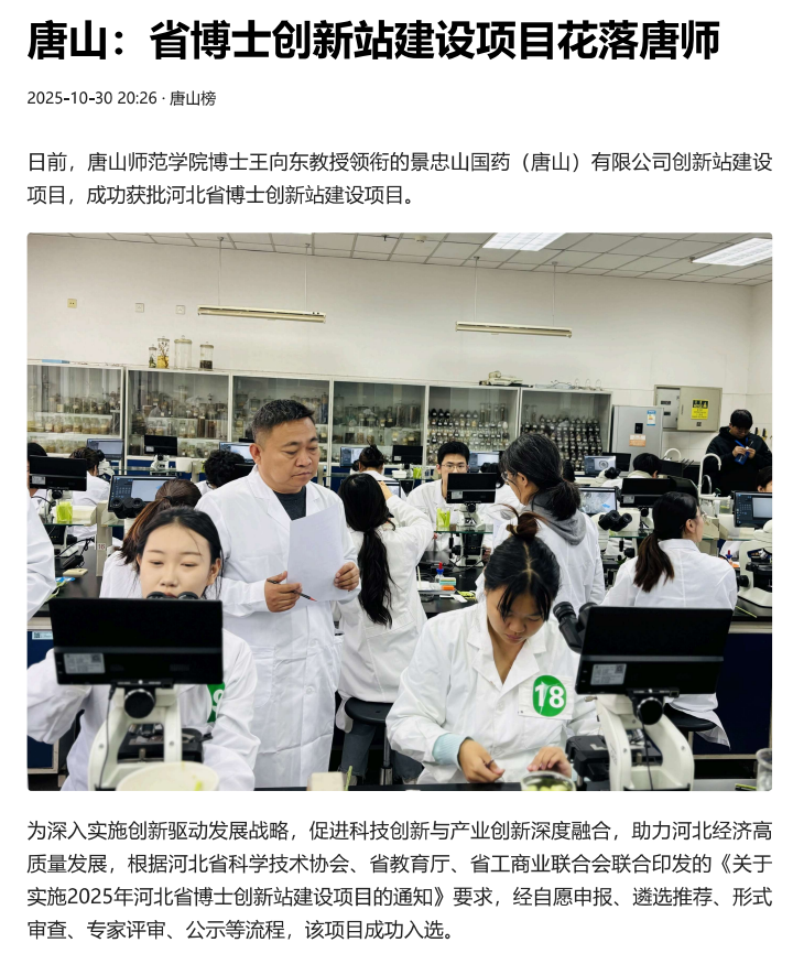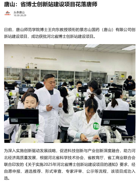 唐山师范学院博士王向东教授领衔的景忠山国药(唐山)有限公司创新站建设项目,成功获批河北省博士创新站建设项目。