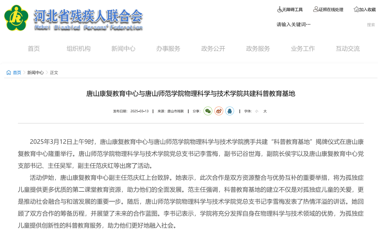 2025年3月12日上午9时,唐山康复教育中心与唐山师范学院物理科学与技术学院携手共建“科普教育基地”揭牌仪式在唐山康复教育中心隆重举行。