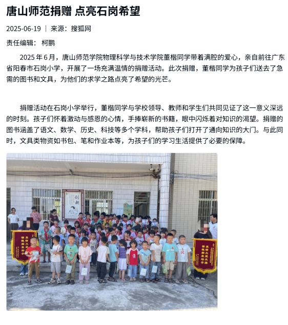 2025年6月,唐山师范学院物理科学与技术学院董楷同学带着满腔的爱心,亲自前往广东省阳春市石岗小学,开展了一场充满温情的捐赠活动。