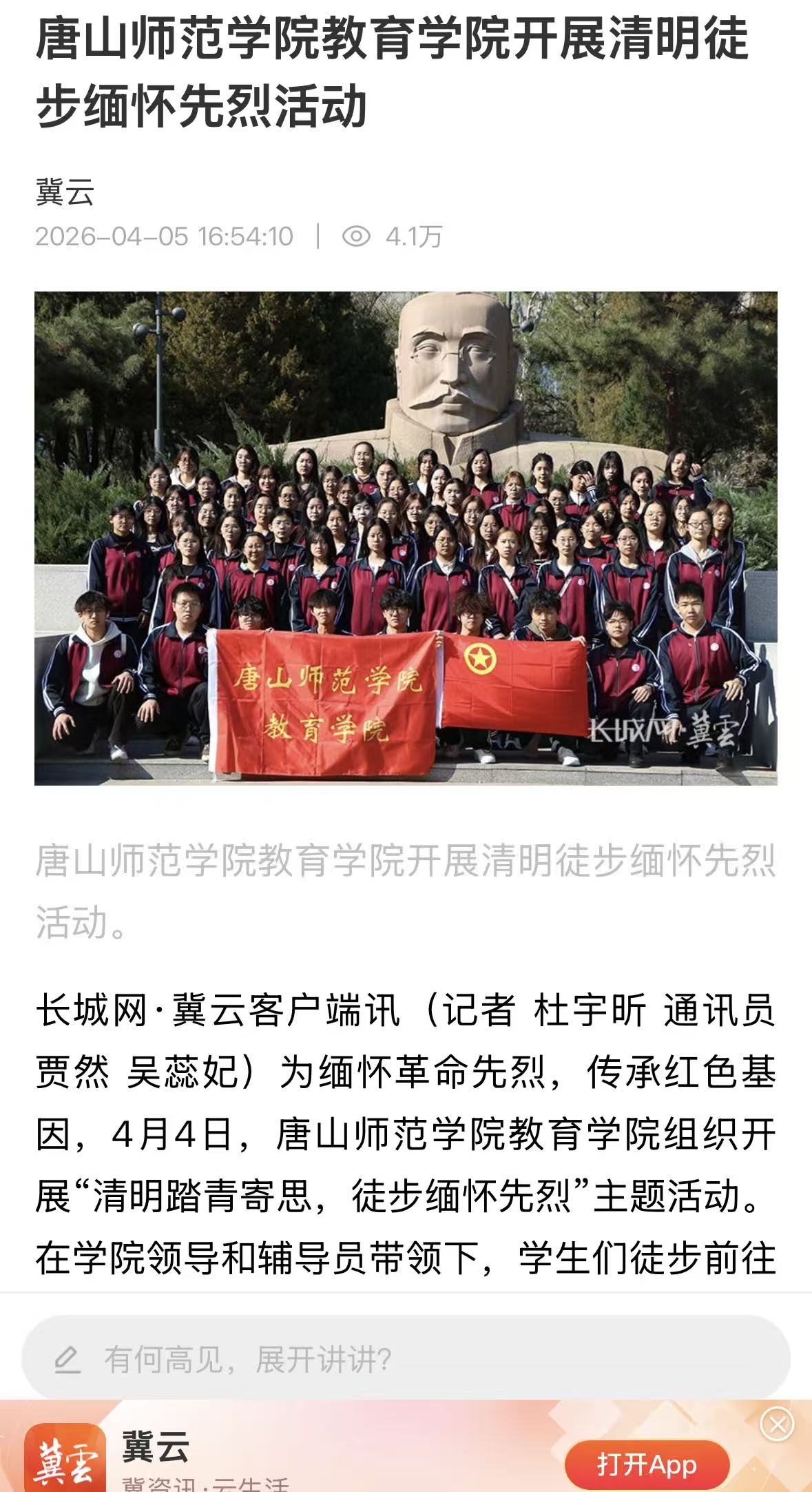 4月4日,唐山师范学院教育学院组织开展“清明踏青寄思,徒步缅怀先烈”主题活动。在学院领导和辅导员带领下,学生们徒步前往大钊公园,在李大钊塑像前举行庄严纪念仪式,将思政课堂搬到红色地标,开启了一堂“行走的思政课”。