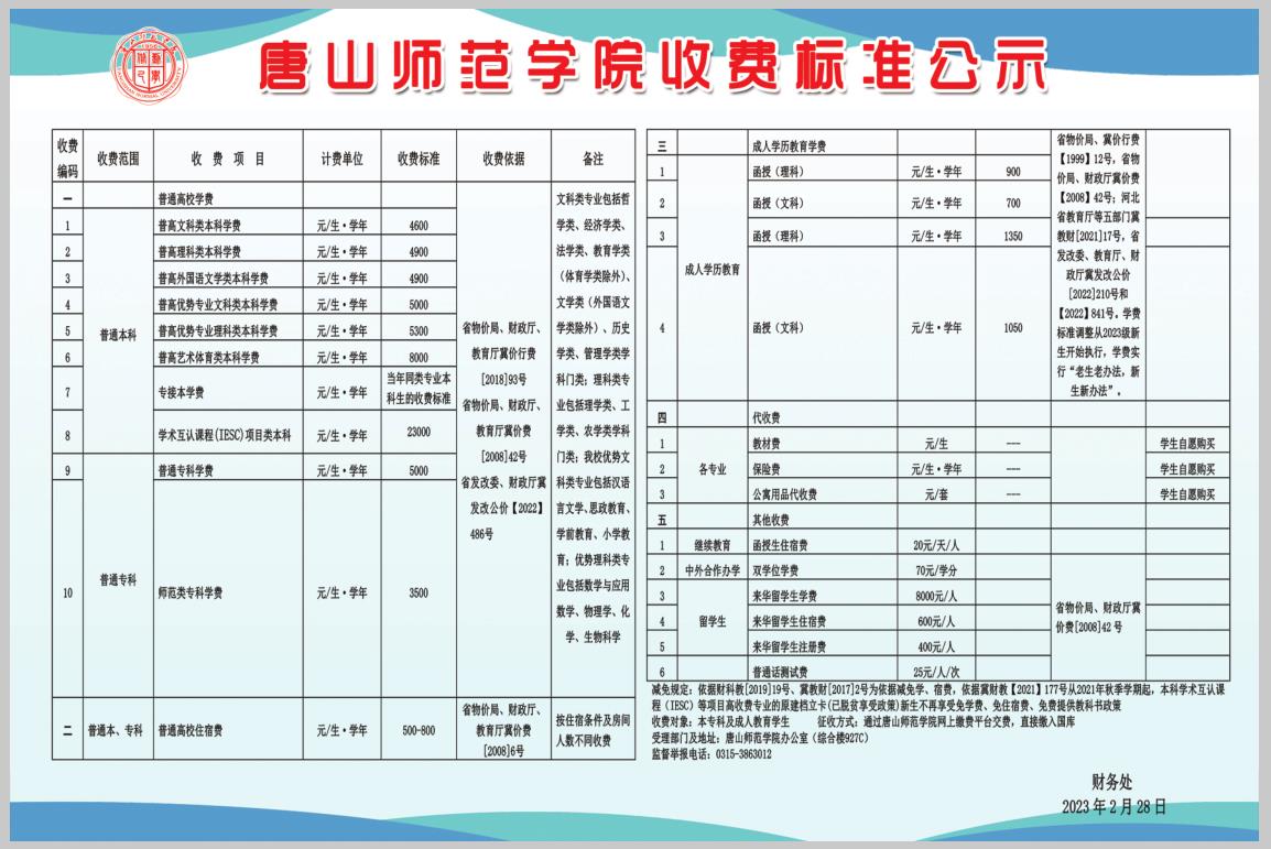 唐山师范学院收费标准公示(2023版)